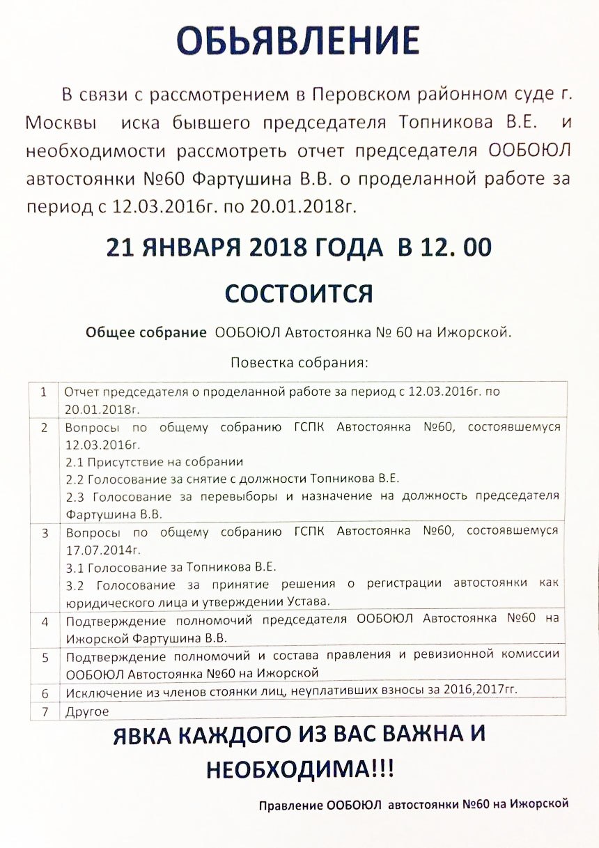 Для успешного решения вопроса необходимо подтверждение решения собрания проведенного 12 марта 2016 г. Просьба всех членов стоянки явиться на собрание 21 января 2018 г в 12:00.