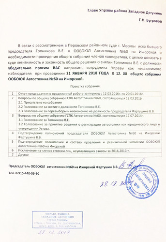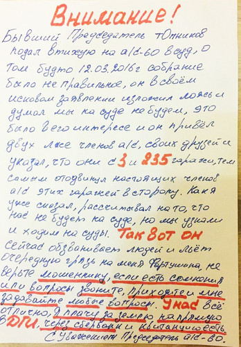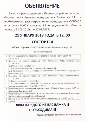 Сегодня 1 июня 2017 В 7 часов утра Гражданин Топников, бывший председатель автостоянки №60, приехал на территорию стоянки в сопровождении женщины. Не предупредив охрану развесил объявления на стенах, сфотографировал их, затем все снял и уехал. Очень интересно что он хочет этим показать. Будем ждать развития событий.