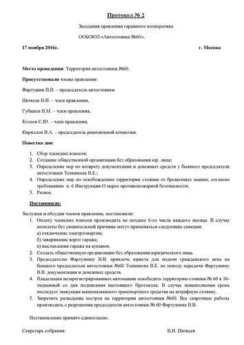 Протокол заседания правления гаражного кооператива «Автостоянка №60» от 17 ноября 2016г.