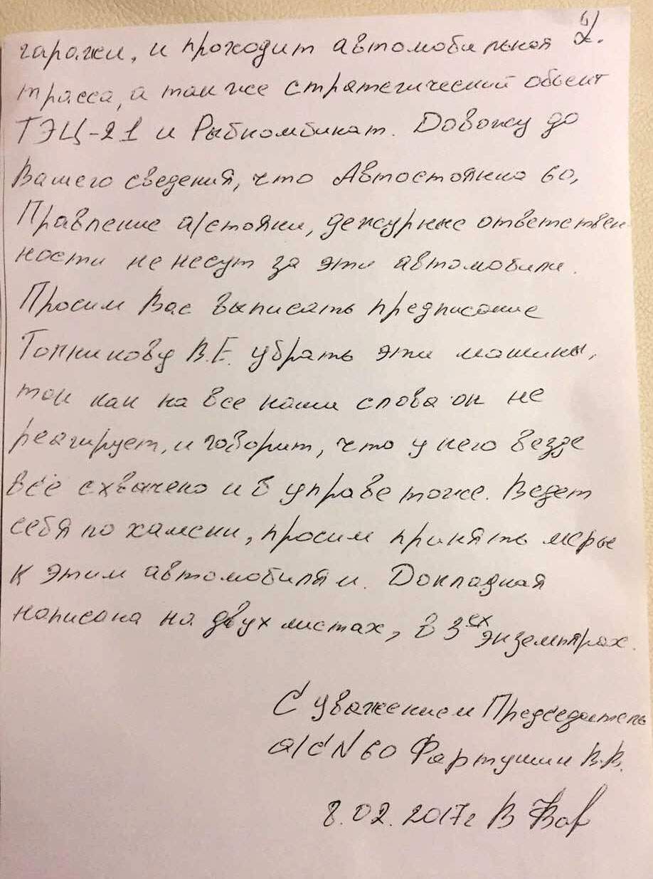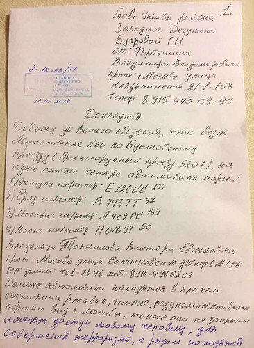 Заявление в Управу об убранных машинах